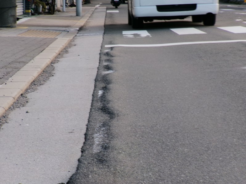 k6同様に、真夏の暑さでアスファルトが柔らかくなり、 左側に押し上げられています。その厚みは4~5センチくらいあります。普通は夏が過ぎると削り取られるのですが、そのままになっているところもあります☹️こんなところを自転車が走れとでも。事故に直結する問題です🤬