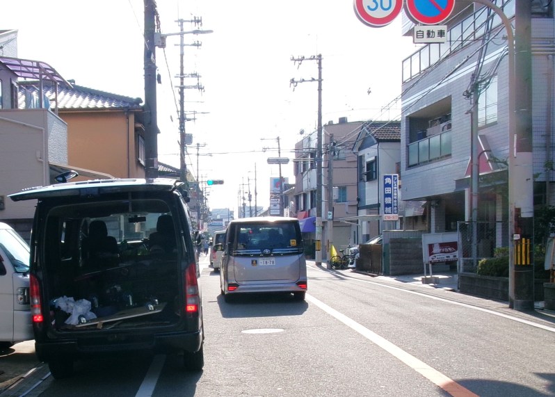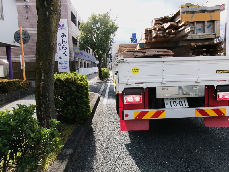 左側に車が停車しています。積み下ろしのようですが、終わるまで待てというのですか😫すぐ後ろには車が続いて来ています😖