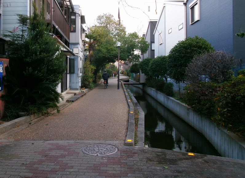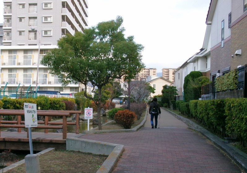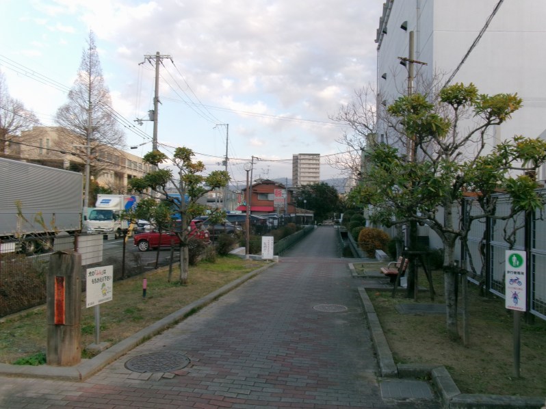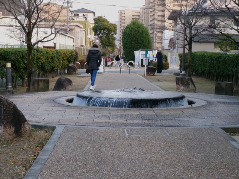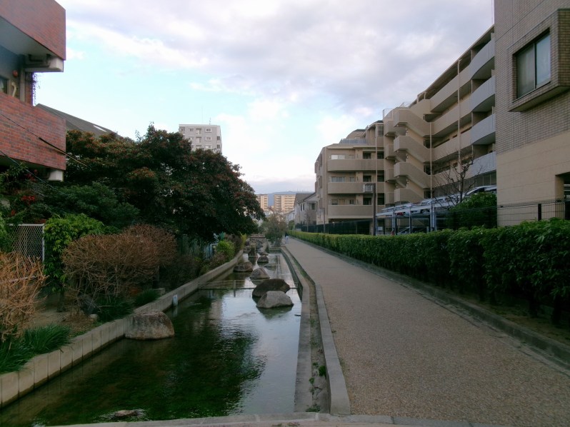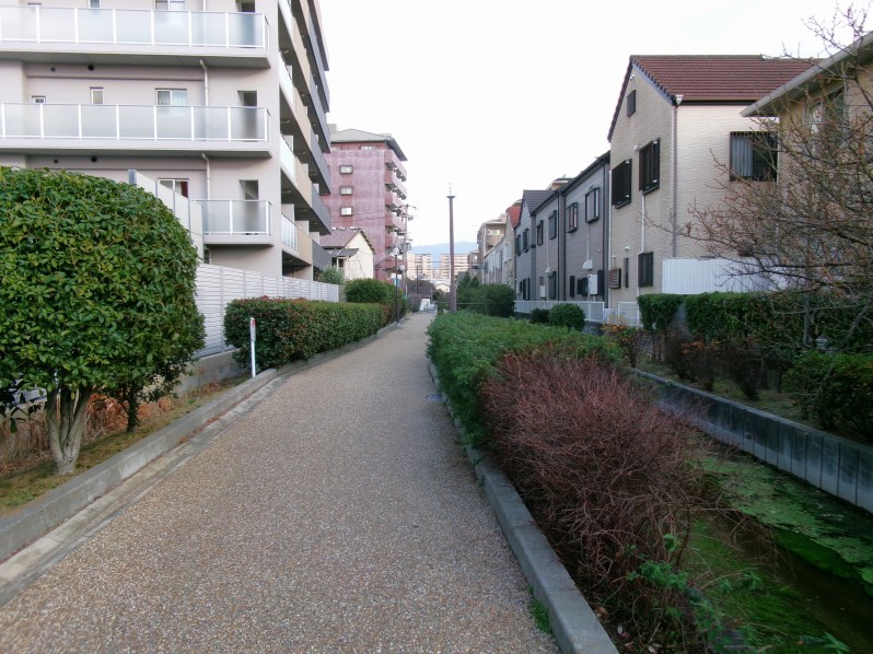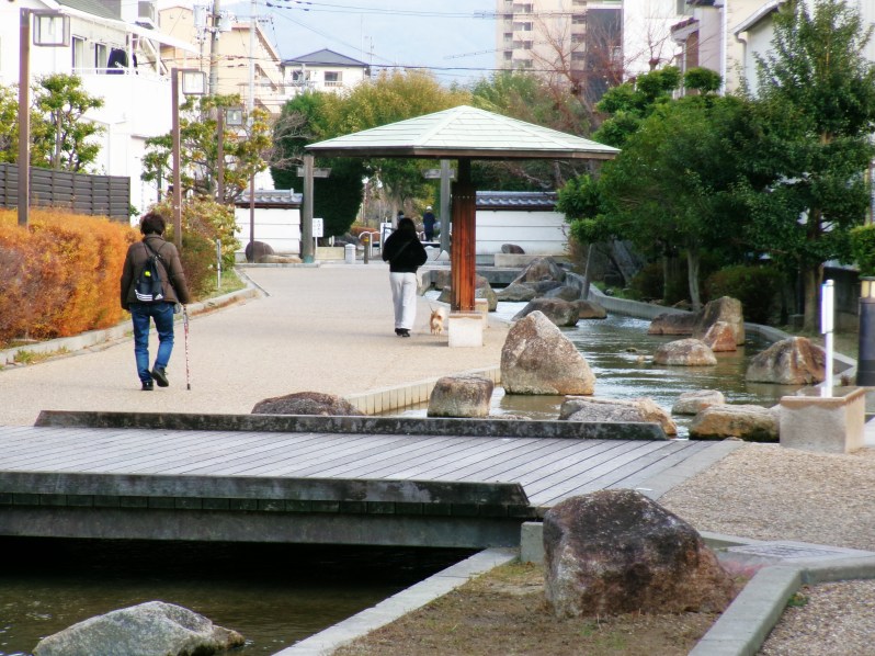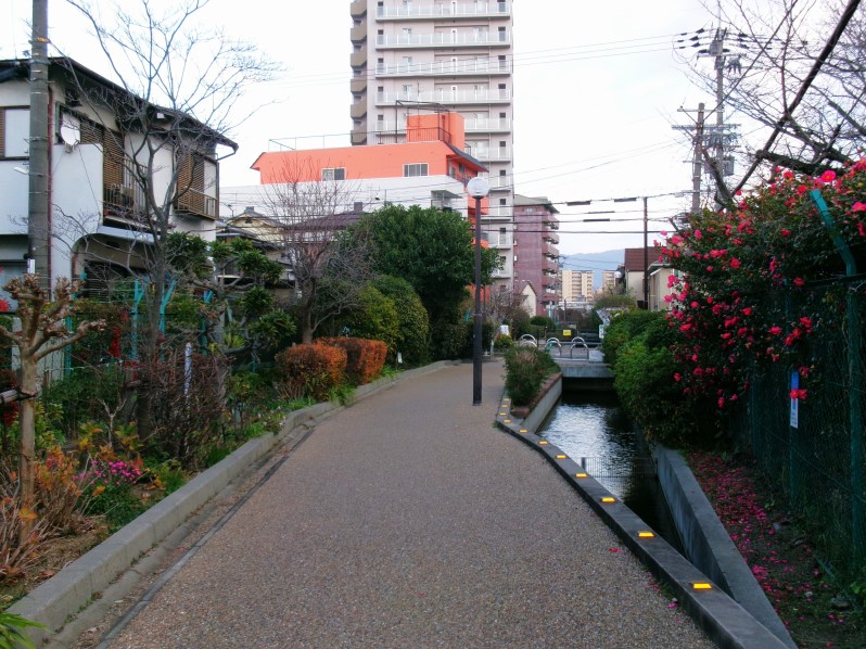せせらぎに沿った通りは、何か所も市道が横断していますが、複数の箇所で古風な築地塀(K9)が築かれています😲もちろん、多くの遊歩道に見られるように、ベンチや東屋も整備されています☺️とおりは、東大阪市民の憩いと安らぎの場になっています😆