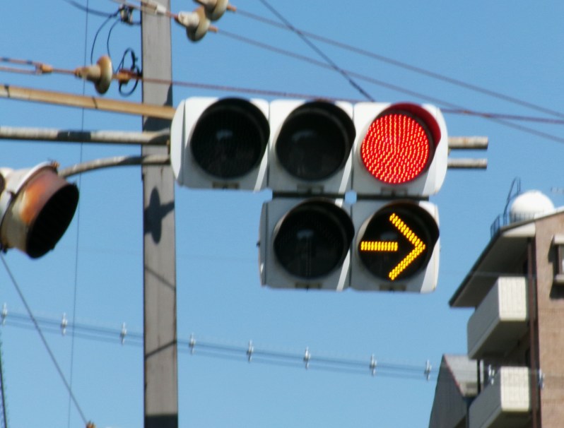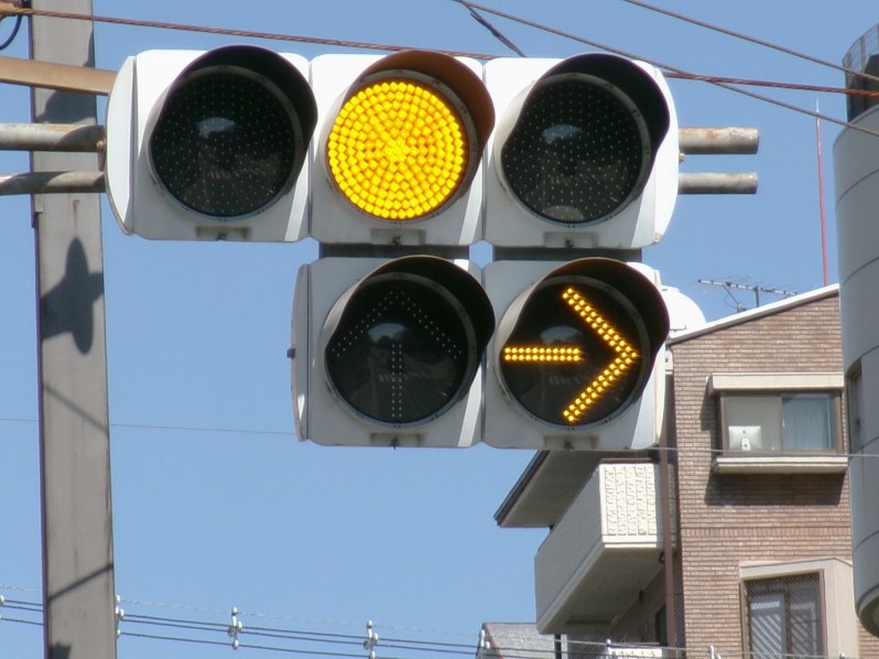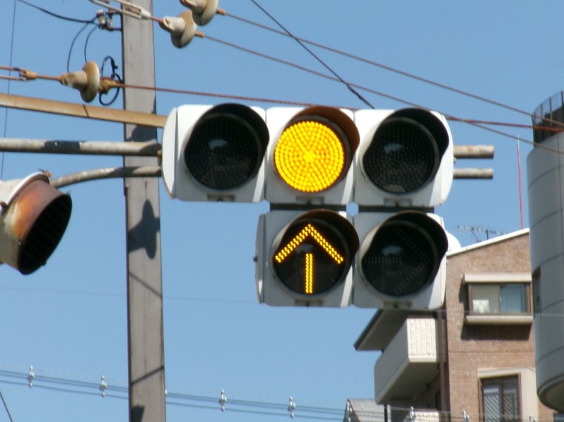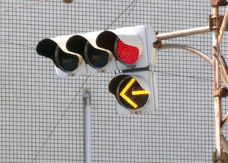 赤、黄灯火の下に黄色の矢印が表示される信号機です😲この信号機は特定の場所にしか設置されていません😲大都市だからあるわけでもありません。大阪市は日本第2の都市、その大阪市に2カ所があるだけです😁