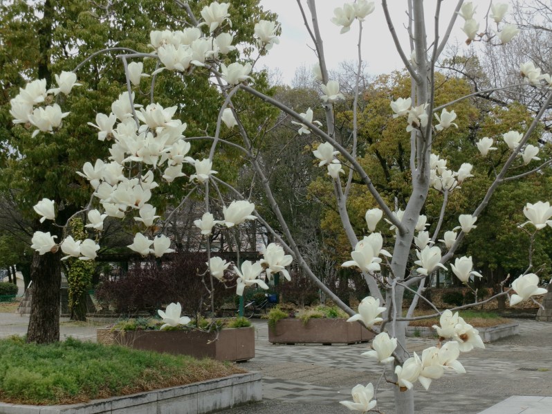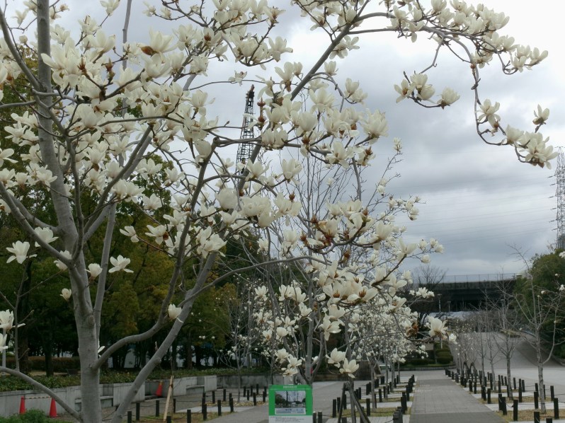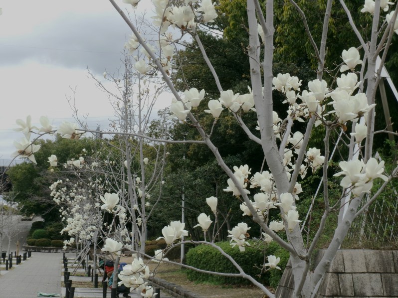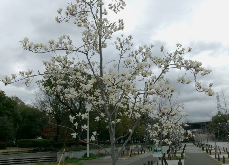 大阪府内にある服部緑地、鶴見緑地、大泉緑地、久宝寺緑地と、府営4大緑地のひとつがここ久宝寺緑地です😲花を咲かせる花木とされるコブシの花が満開になっています(撮影・3月19日)