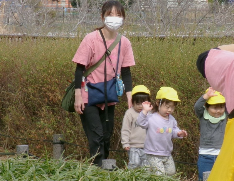 公園を、先生(保育士さん)に連れられてのお散歩。こうした光景は素敵です。先生と手をつないでの子ども、ホント可愛いです。保育園で先生はお母さんのような存在ですから。子どもたちもみんな、例外なく慕っているし、ついそんな光景に見とれてしまいます。純真無垢な子どもたち、そんな子どもたちをみるたびに「健やかに育って」と願わずにはいられません😆
