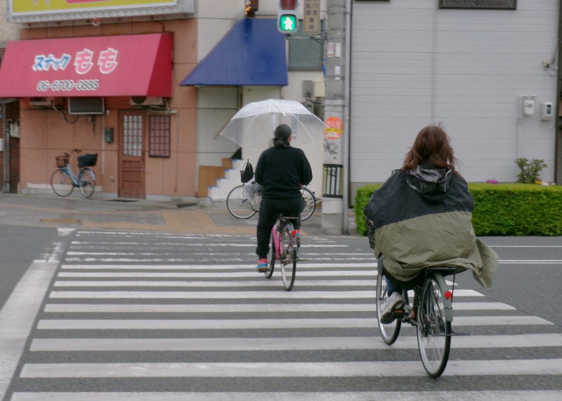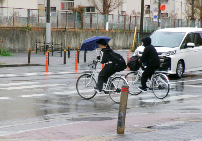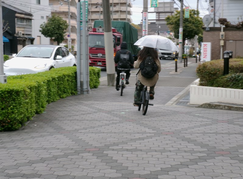 改正法が施行された1日、自転車はこの日から違法になる走行を堂々とやっていました。雨の天気でしたが、交通量の多い午前8時から1時間、記者は自転車走行を撮影と合わせて見ましたが、改正法を守っていたのはたった1人でした。それだけ危険な車道は走れない、雨の日の傘は必需品という認識のようです。