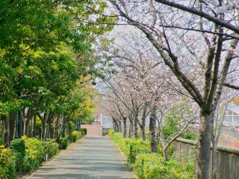 住之江区域を流れる住吉川に沿ったサクラ並木の遊歩道です😄川には亀さんが生息しており、シラサギさんも狩にやってきます。そんな住吉川に沿った遊歩道は、区民の散歩やジョキングに利用されています😁
